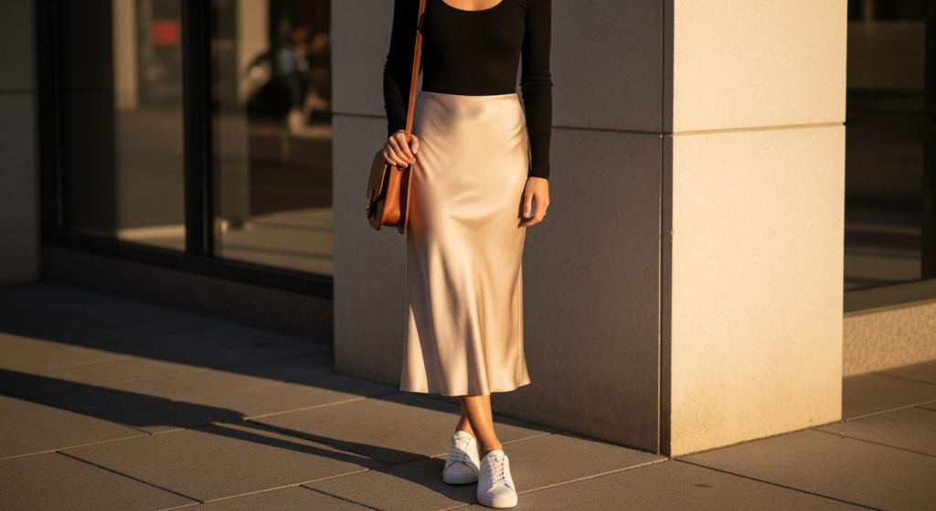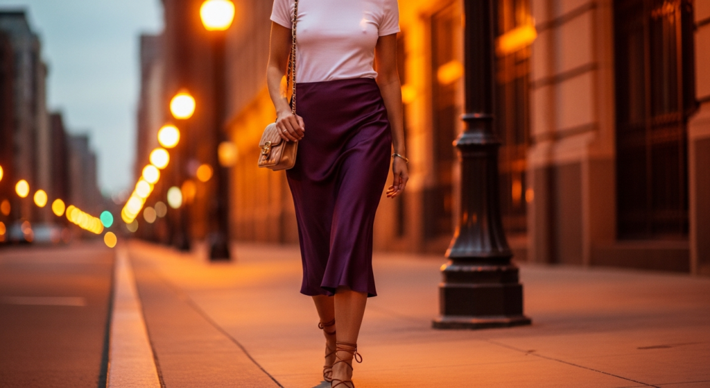 - Choose a midi skirt in a fluid, beautiful fabric: a satin-finish bias-cut in a jewel tone, a lightweight cotton or linen in a warm solid, a flowy chiffon in a soft print, or a ribbed jersey midi skirt in a deep seasonal color — the fabric determines the look’s occasion register from relaxed to polished.