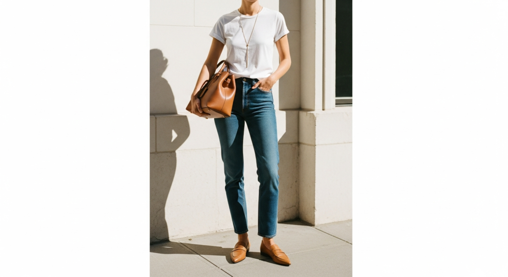 - Choose one footwear approach that shifts the look’s register: clean white leather minimal trainers for the most classic version; tan leather loafers for a polished casual update; or simple leather ankle boots for an autumn-ready interpretation.