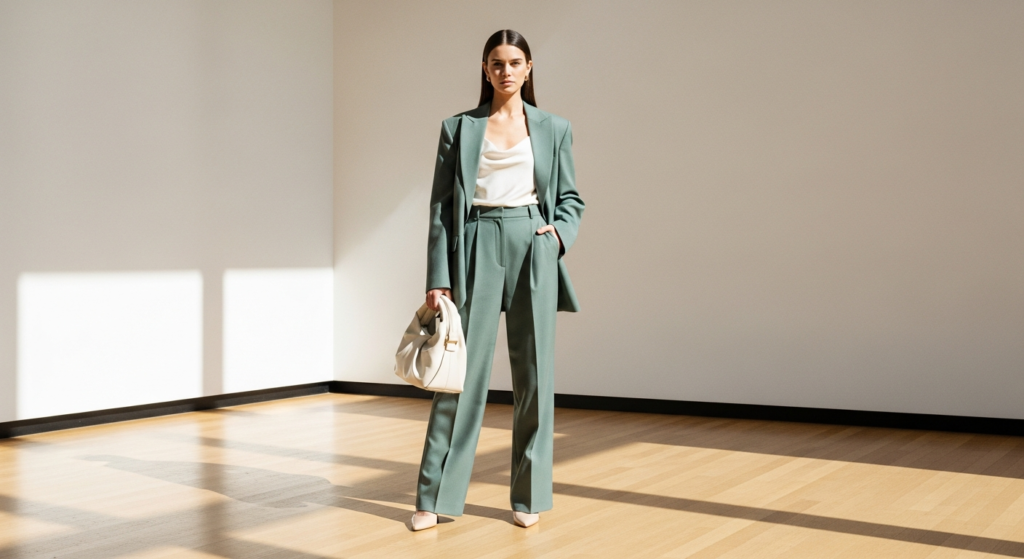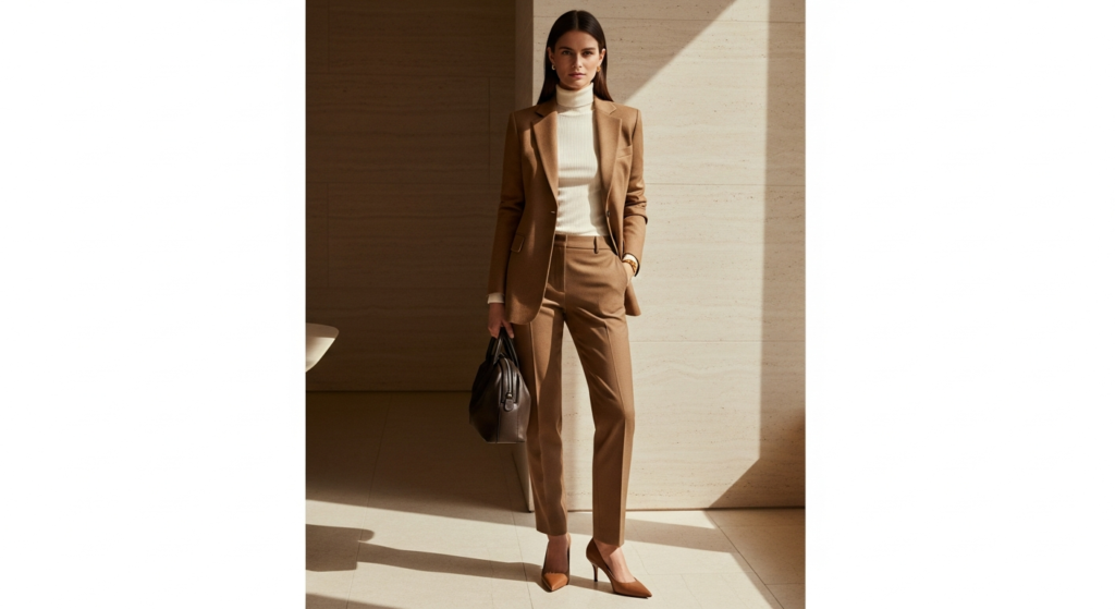 • A blazer in the same palette, worn open, adds structure and authority without breaking the tonal flow.