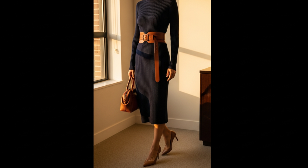 11. Knit Dress with a Structured Belt — Texture Meets Authority