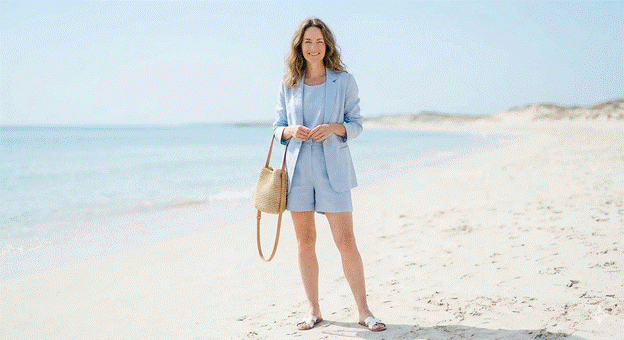 A linen co-ord — whether a blazer and wide-leg trouser, a short-sleeve shirt and tailored shorts, or a wrap top and midi skirt — communicates a level of considered dressing that elevates it immediately above the average summer outfit. In warm neutrals — stone, sand, pale terracotta, warm ecru, or dusty sage — a linen co-ord is as appropriate for a summer work occasion as for a beachside lunch or an evening aperitivo.