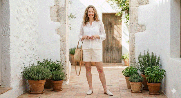 Styling Tip: The knotted hem is the single styling detail that most transforms this summer fit. Gather the front tails of the linen shirt, twist them together, and tie loosely at the waist to create a casual midriff-grazing front with the shirt tails hanging freely at the back. This detail immediately shifts the look from simply comfortable to deliberately styled, defining the waist and revealing the proportion between the shirt and the shorts with a fashion intentionality that a standard tuck cannot match. Add white leather slides or leather thong sandals and a simple gold chain.