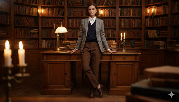 The defining aesthetic clothes pieces for a dark academia wardrobe include a structured blazer in a heritage pattern — herringbone, windowpane check, or a fine plaid — paired with tailored high-rise trousers, a collared button-front shirt in cream or white, and a quality knit sweater vest layered over the shirt and beneath the blazer. Every piece should suggest age, quality, and the kind of daily intellectual engagement that treats clothing as a serious, considered practice rather than a casual afterthought.