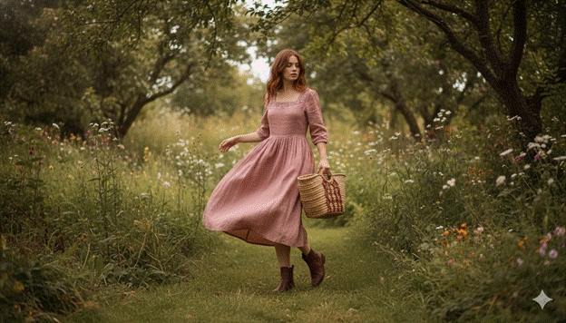 Styling Tip: The most beautiful cottagecore aesthetic clothes are those in genuine natural fabrics — organic cotton, undyed linen, natural wool — rather than synthetic alternatives that reference the aesthetic visually without delivering the tactile authenticity that the cottagecore philosophy requires. A flowing floral linen dress in dusty rose and sage worn with leather flat ankle boots and a woven basket bag creates the most genuinely beautiful and most photographically compelling cottagecore aesthetic clothes outfit available. Add a simple hand-embroidered hair ribbon or a small pressed-flower brooch for the specific, intimate personal detail that this aesthetic celebrates.