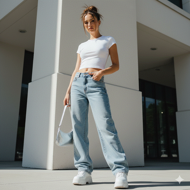 The defining aesthetic clothes of the Y2K revival wardrobe include low-rise bootcut or wide-leg denim in a pale or medium wash, fitted baby tees in bright or pastel tones, metallic or iridescent mini skirts, platform trainers and chunky shoes, cropped cardigans, and the specific accessories that most directly signal the era: mini shoulder bags, butterfly clips, and logo-heavy belts. The palette is deliberately flashy: metallic silver, candy pink, baby blue, lime, and the specific warm white of a Y2K minimalist moment.