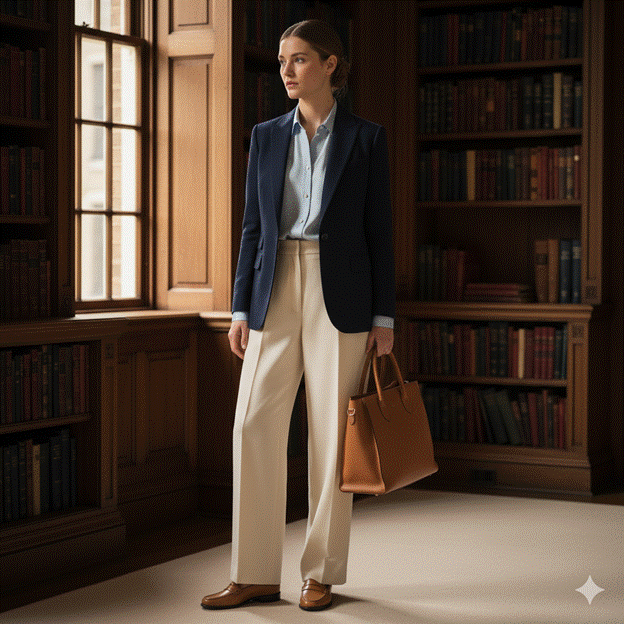 The defining aesthetic clothes of the old money wardrobe are the classics of European and American heritage dressing: a perfectly fitted navy blazer, a quality cashmere V-neck in camel or cream, a pearl-button blouse in white or pale blue, wide-leg or straight-leg trousers in premium wool, a classic trench coat, penny loafers in polished leather, and understated accessories in quality materials — a simple watch, a strand of real or quality faux pearls, a good leather bag without visible branding.