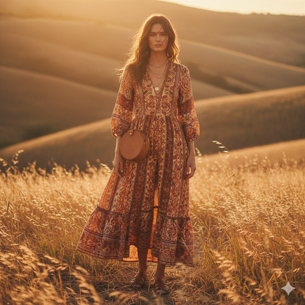 The defining aesthetic clothes of boho chic include flowing maxi dresses in warm floral prints or solid earth tones, embroidered blouses with folkloric detailing, high-waisted wide-leg denim, suede fringe vests and jackets, woven leather sandals, and the layered jewellery — rings on multiple fingers, stacked bracelets, layered necklaces in warm gold and natural stones — that is as definitionally boho chic as any garment. The palette is warm, earthy, and sunset-saturated: terracotta, ochre, dusty rose, sage green, warm cream, and deep teal.