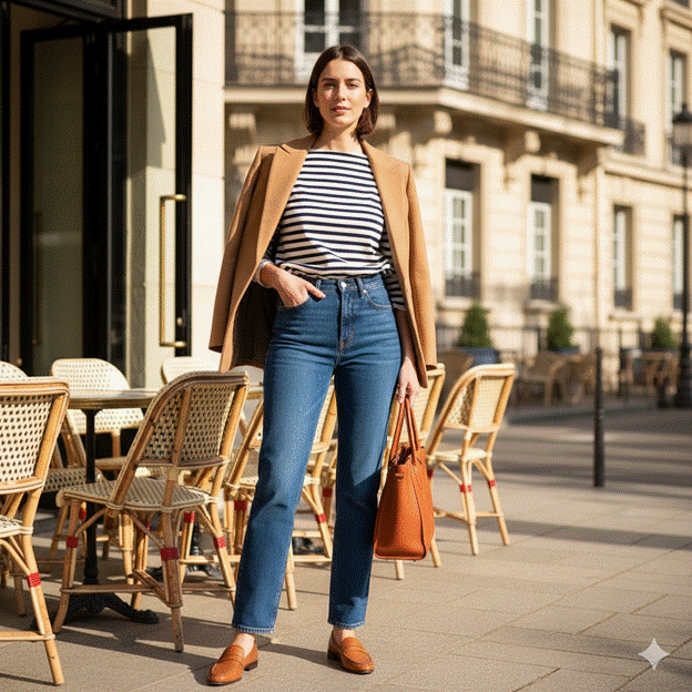 The defining aesthetic clothes of the French girl wardrobe are classic, quality, and relatively few: a great Breton striped top, a quality white or cream blouse with slightly billowing sleeves, a well-fitted straight-leg or slightly tapered dark denim, a quality blazer in a neutral, a simple midi skirt in a quality fabric, a great trench coat, leather ballet flats or simple loafers, and a quality leather bag in a warm neutral. Nothing more is required; everything here is worn with the specific quality of casual confidence that is the French girl aesthetic’s most important and most imitable quality.