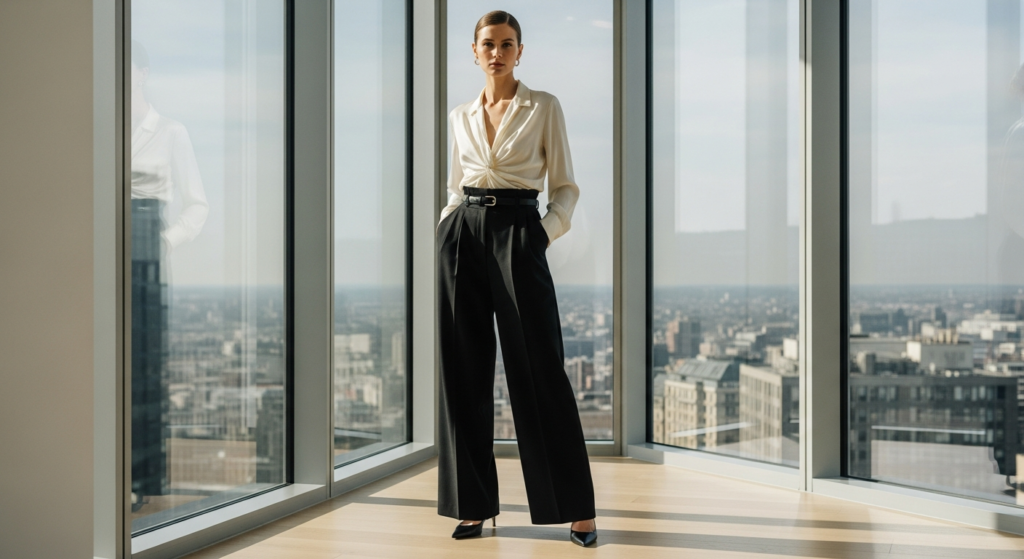 A beautifully cut pair of high-waisted wide-leg trousers in black, ivory, or charcoal grey, paired with a fluid silk or satin-finish blouse tucked cleanly at the front, is one of the most enduring combinations in professional fashion. The contrast between the structure of the trousers and the softness of the blouse creates an effortless visual balance.