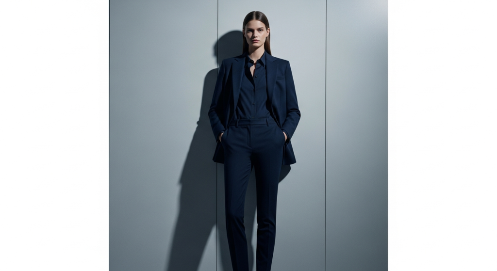 A navy-on-navy look (think slim-fit trousers, a button-front shirt, and a tailored navy blazer) is timeless and commanding. So is an all-grey ensemble: grey wide-leg pants, a pale grey silk blouse, and a mid-grey blazer with subtle structure.