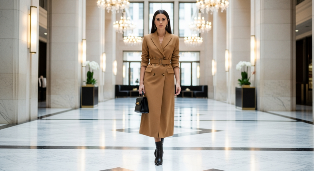 A double-breasted blazer dress in camel, cream, or charcoal grey creates an instant visual authority. It reads as a full power suit while requiring zero effort to coordinate. Mini, midi, and longline styles all work — choose the length that suits your workplace’s dress code and your personal comfort.
