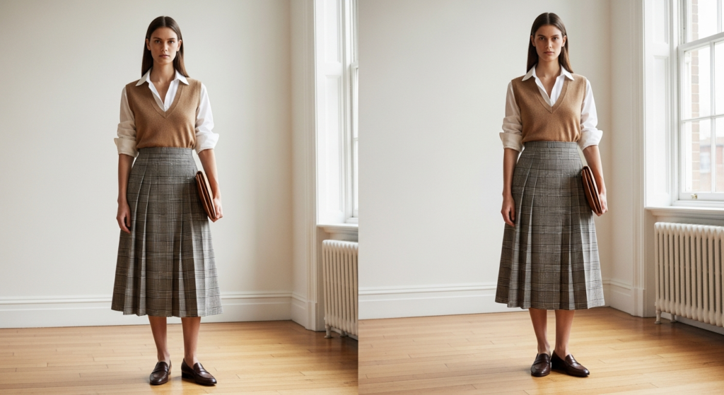 The midi skirt is having its longest sustained moment in contemporary fashion — and in the workplace, it’s earning particular love. A structured, bias-cut or A-line midi skirt in a muted print (Glen plaid, micro-check, subtle stripe) or a solid satin-finish fabric communicates elegance effortlessly.