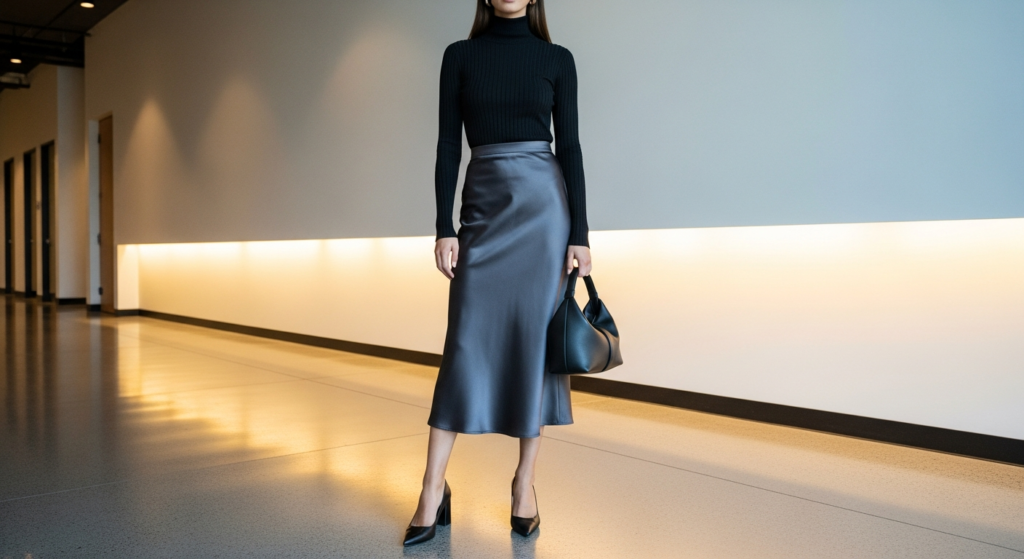 Styling tip: The footwear decision is crucial with a midi skirt. A pointed-toe flat or low block-heel keeps the look modern and workplace-appropriate. Avoid overly casual footwear — the skirt deserves shoes that match its level of intention.