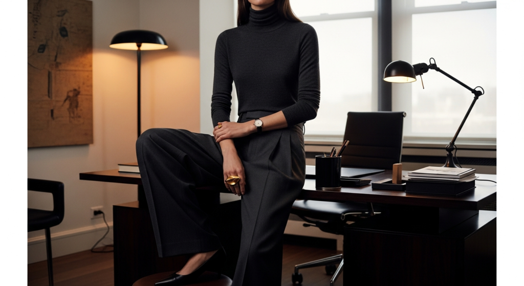 The turtleneck is a work wardrobe staple that consistently registers as both intellectual and elegant. A fine-gauge merino wool turtleneck in charcoal, ivory, chocolate brown, or deep forest green worn with tailored wide-leg trousers is a complete and powerful work outfit.