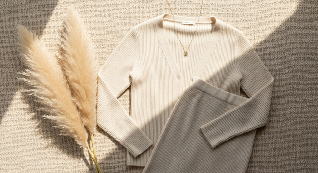 A beautifully crafted knit set — matching cardigan and skirt, or sweater and wide-leg trouser — occupies the space between comfort and elegance perfectly. Ribbed knits in soft wool or cashmere blends have become a cornerstone of the dream wardrobe for their warmth, texture, and quiet sophistication.