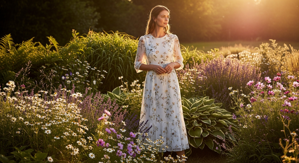 Styling Tip: Pair a white floral cottagecore dress with brown leather sandals and a woven basket bag. Add a simple gold pendant necklace to keep the look elegant rather than costume-like. Soft, dewy makeup completes the aesthetic perfectly.