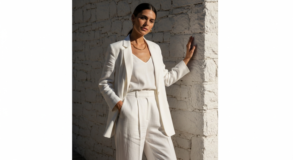 Styling Tip: Choose sets in premium fabrics like linen, cotton poplin, or crepe for a polished look. Keep accessories minimal — a sculptural gold cuff, barely-there heels, and a structured tote in camel or nude. Avoid over-accessorizing; the power of this look is in its restraint.