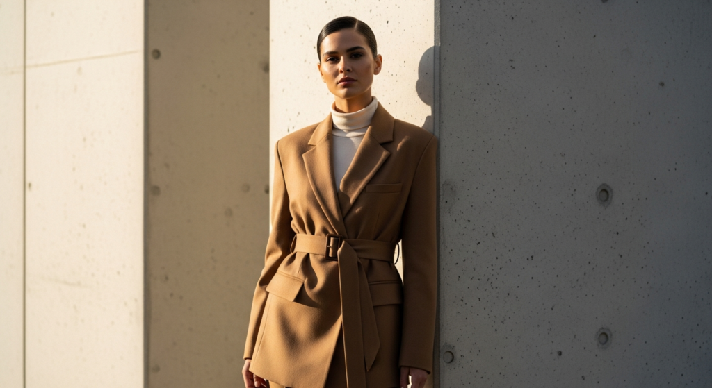Styling Tip: For a viral-worthy look, wear an oversized camel or ivory blazer belted at the waist over a fitted turtleneck and wide-leg trousers. Add pointed-toe heels and a small structured bag. The proportions create a balanced, editorial silhouette that photographs beautifully.
