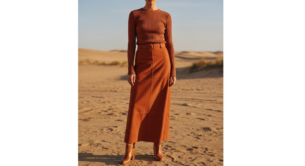 Styling Tip: Mix textures within the same colour family to add depth and visual interest. Pair a suede terracotta skirt with a ribbed knit top in a slightly lighter shade. Add tan leather boots and a camel structured bag. The tonal variation keeps the look dynamic rather than flat.