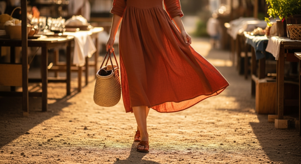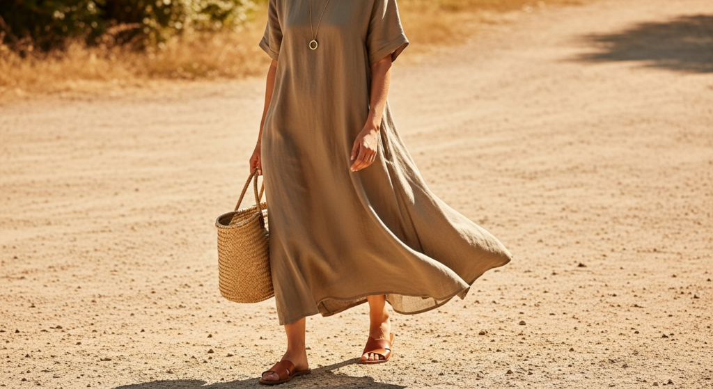 Styling Tip: Choose a linen midi dress in a warm, considered colour — warm sand, dusty sage, terracotta, pale denim blue, or soft ivory — in a quality fabric with genuine body and natural movement. The dress should flow rather than cling, moving with the body and the summer breeze for the most beautiful and the most photographically stunning result. Add flat leather sandals or simple leather slides, a woven basket tote, and delicate gold jewellery — a thin chain necklace, small hoop earrings. Wear with a minimal, sun-touched makeup look and loose, naturally styled hair. The linen midi dress summer outfit photographs most beautifully outdoors in warm golden morning or afternoon light.