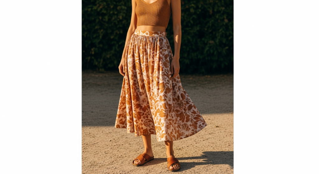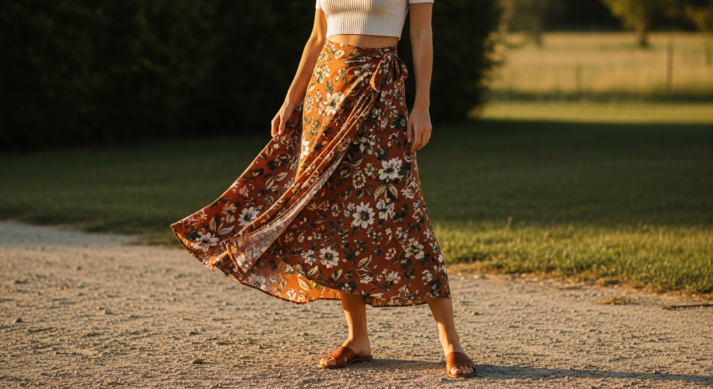 Styling Tip: Choose a wrap skirt in a quality lightweight fabric — a fine rayon, a cotton lawn, or a quality viscose — with a print that carries genuine visual warmth and personality. The top should be as simple as possible — a fitted white or cream camisole, a simple fitted tee, or a quality ribbed crop top — in a tone drawn directly from the skirt’s print palette. Add flat leather sandals or quality thong sandals, a simple woven or leather bag, and minimal jewellery. The wrap closure should sit cleanly at the waist — use a small safety pin inside the wrap if necessary for security and confidence of movement in summer breezes.