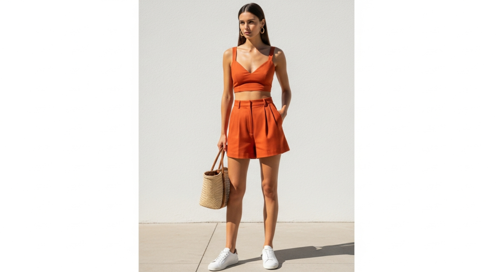 A matching short set — coordinating cropped top and high-waist shorts in the same bright, saturated summer colour — is the girl outfits summer style that most joyfully and most directly celebrates the season’s permission to embrace vivid, warm, unapologetic colour. In a genuinely vibrant summer tone, a matching short set communicates confidence, personality, and a complete, joyful ease.