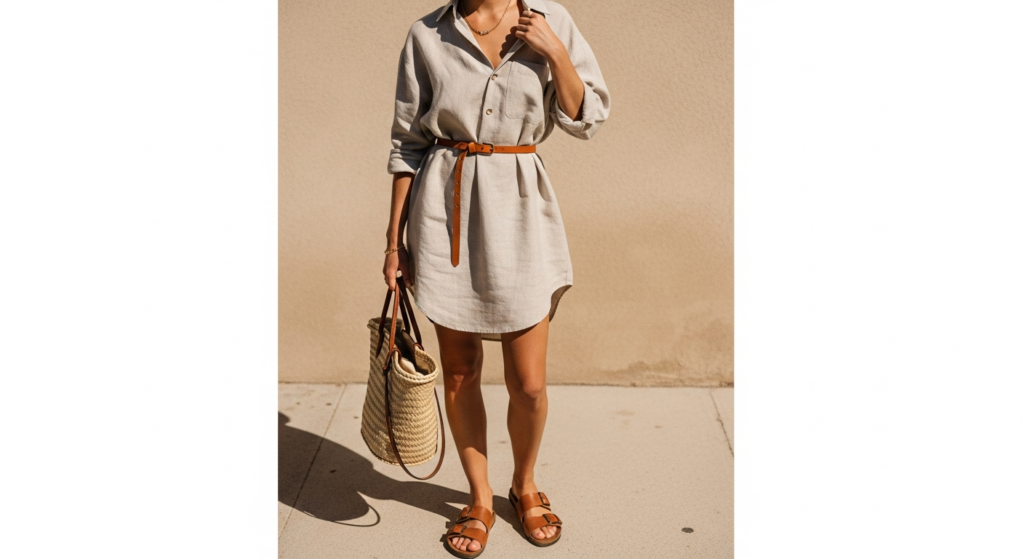 Styling Tip: Choose a shirt that is genuinely oversized — at least two sizes larger than your standard size — in a quality, lightweight fabric with beautiful drape. A fine linen in a warm neutral, a quality cotton in a classic stripe, or a beautiful printed shirt in a warm botanical or abstract print all work wonderfully as summer shirt dresses. Wear unbelted for a loose, relaxed summer feel or with a thin leather belt defining the waist for a more structured interpretation. Add leather sandals or simple slides, a quality woven or leather tote, and minimal jewellery. Leave two or three buttons casually undone at the neckline for the most authentic, effortless summer shirt dress aesthetic.