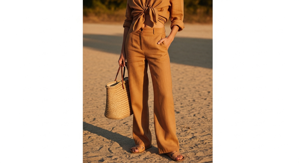 Styling Tip: Choose a linen co-ord in a warm, universally flattering summer tone — warm oatmeal, dusty sage, terracotta, warm ivory, or soft denim blue. Wear the shirt loosely tucked or tied at the waist over the wide-leg trouser for the most casual, summer-appropriate styling. Add leather sandals or simple canvas espadrilles, a woven or leather tote, and minimal jewellery. Embrace the natural wrinkle of linen — it is the fabric’s most organic and most beautiful quality and the mark of a person who has genuinely understood what summer dressing means at its most authentic.