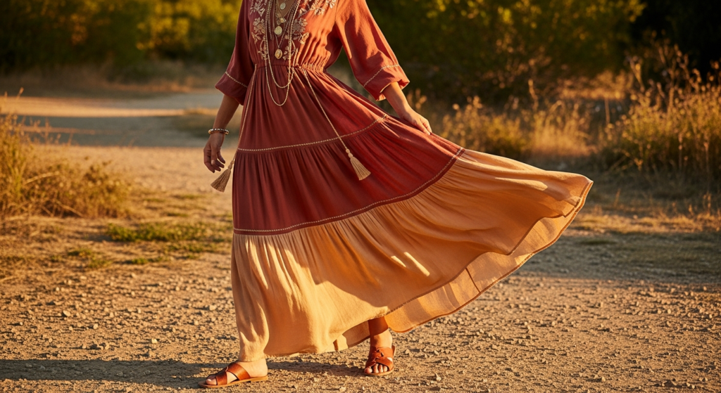 Styling Tip: Choose a boho maxi dress in a quality fabric with genuine, organic movement — a fine rayon, a cotton voile, or a quality viscose blend. Warm, earthy summer tones — terracotta, dusty rust, warm sage, and golden cream — suit the boho maxi most naturally and most photographically beautifully. Flat leather sandals or wedge sandals work most beautifully with a boho maxi; platform shoes or trainers disrupt the organic, feminine flow of the silhouette. Add a quality woven or leather bag, layered delicate gold necklaces, and simple gold hoop earrings for a fully cohesive, warmly beautiful boho summer aesthetic.