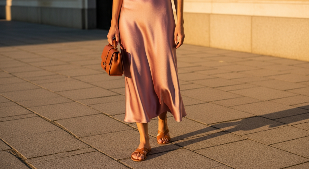A satin or silk-finish slip dress — in a warm, considered tone with a clean, body-skimming silhouette — worn with simple flat leather sandals is one of the most quietly elegant and the most genuinely sophisticated girl outfits summer styles available. It is the summer look that requires the least assembly and communicates the most about genuine personal taste.
