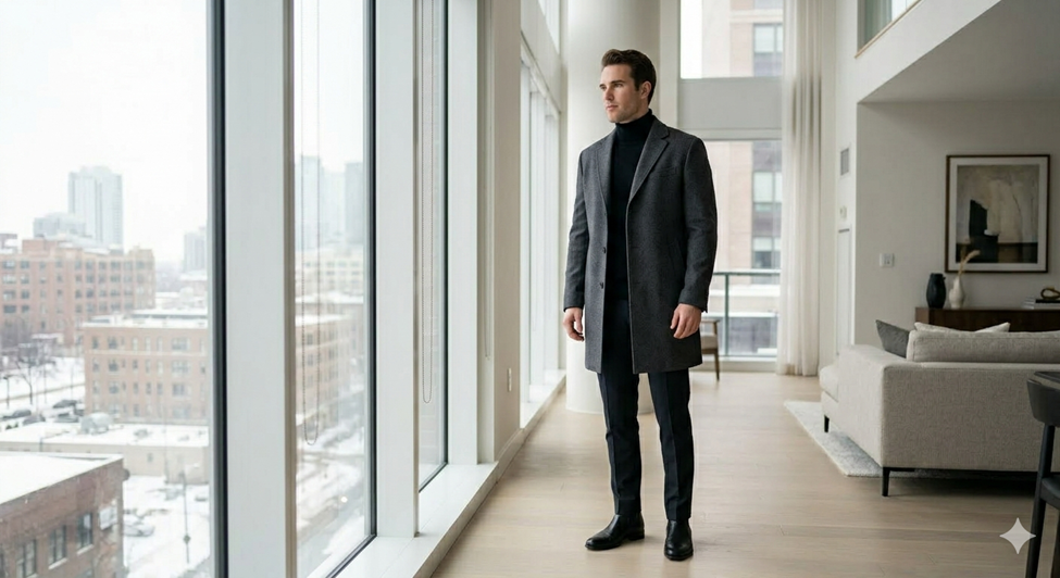 A turtleneck layered beneath a structured overcoat creates a timeless winter silhouette.
