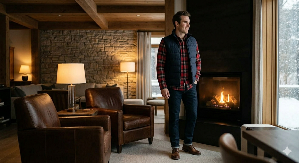 Flannel shirts bring warmth and rustic charm, while a quilted vest adds a layer of insulation without bulk.
