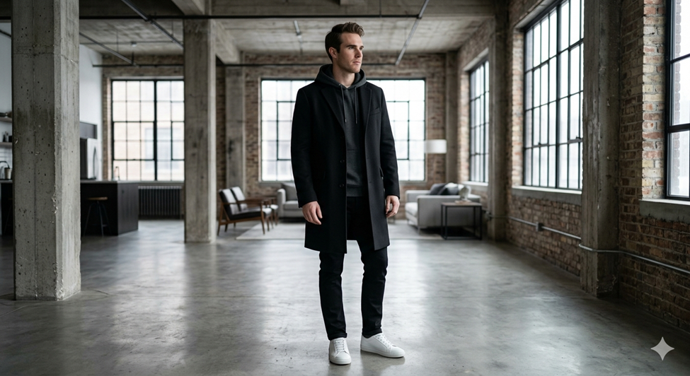 A hoodie layered under a long wool coat creates an effortless blend of comfort and sophistication.